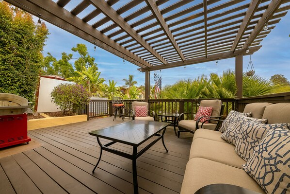 The spacious private deck offers lovely canyon views - have tea for two at the charming high-top bistro table or chat with your friends beneath the pergola in the outdoor lounge area.