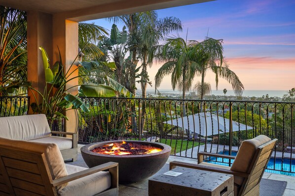 Step into the open-concept living area where expansive sliding glass doors lead to one of several sun-drenched patios—ideal for dining al fresco, relaxing by the fire pit, or watching the sun set over the Pacific. The chef's kitchen features high-end appliances and plenty of space for cooking and entertaining.