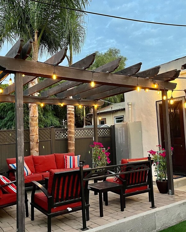 The backyard is definitely the highlight of the property. With outdoor seating for 7, there is plenty of space to relax with your guests. New grass turf installed give front and backyard a clean look. Grill and propane in backyard. Dog friendly too, fenced in front and back yards, so your good boy or girl are safe! Home recently refurnishing place with new TVs, beds, and living room furniture. Washer & dryer in unit. Parking in back. Quiet street with little traffic, quiet neighborhood. Walking distance to shops, grocery, and liquor store. $100.00 pet fee per dog, 1 dog max. Discuss if you have more than one dog before making reservation.