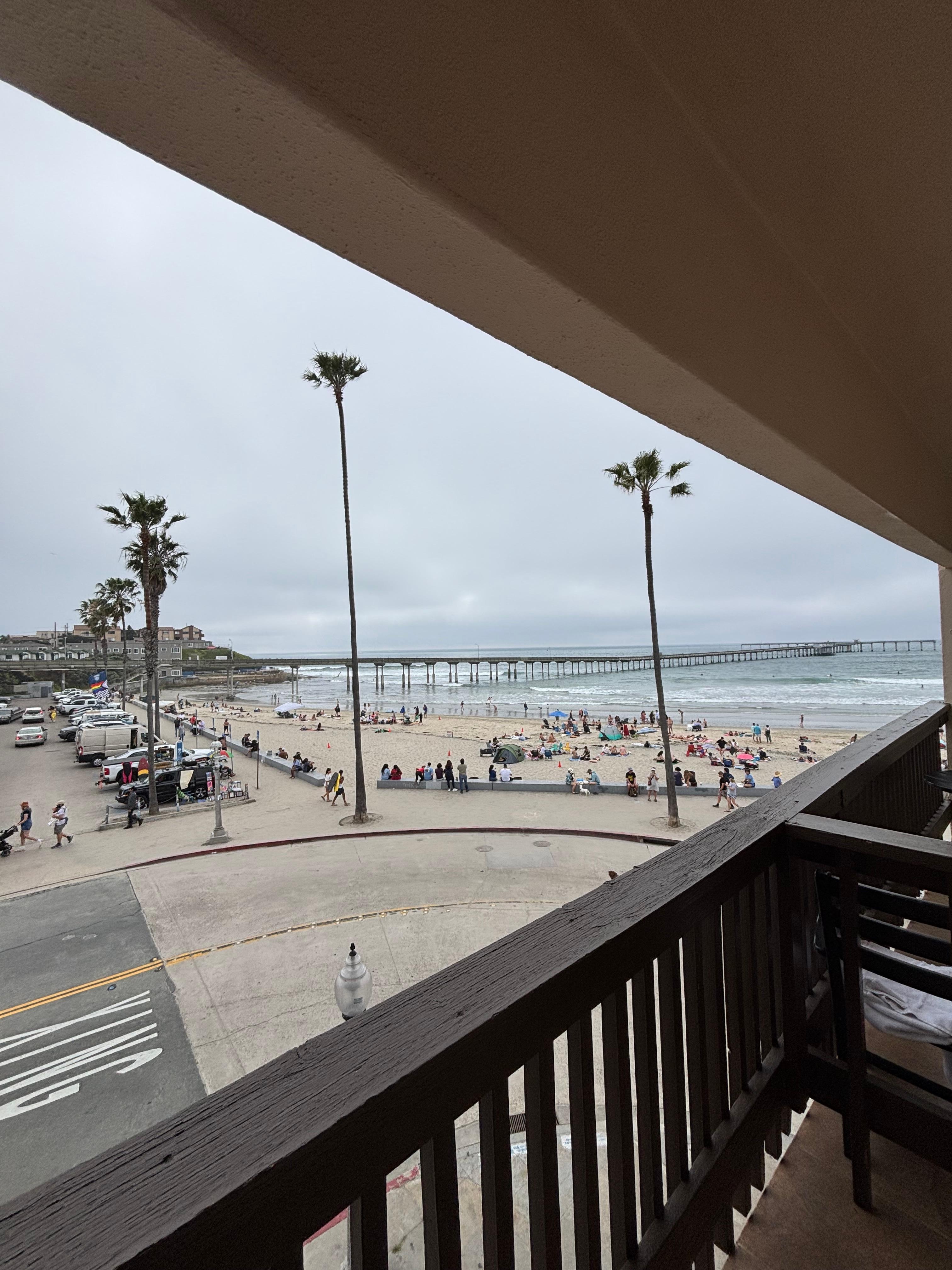 Located in heart of OB. The hotel is easy to park and right on the beach. Rooms and bathrooms are small and very clean. The room was a bit noisy—you can hear other rooms (TV, conversations) and you are in the flight path for LAX so we heard planes constantly at night. If you like being in the gritty and lively part of the beach and don’t need luxurious accommodations, this is a great, clean and convenient choice. You can walk everywhere. Great view of beach and people watching.