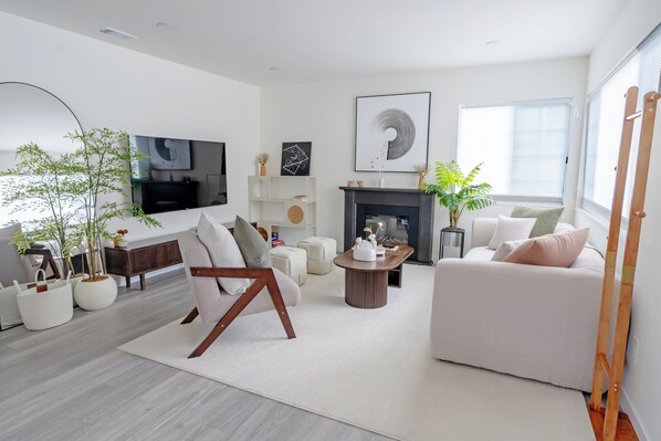 A spacious and sun-filled living area with chic décor: