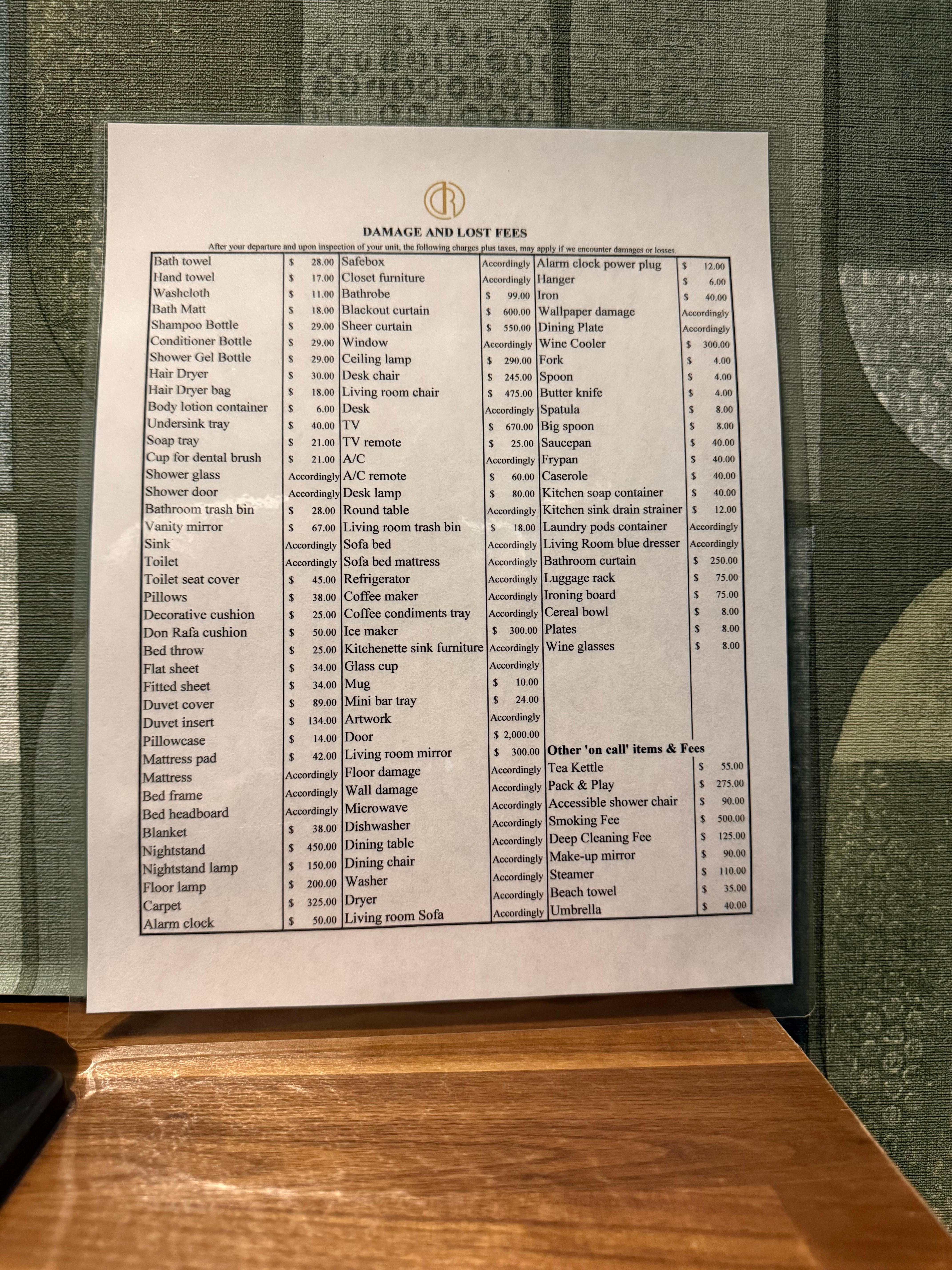 The policies felt unusually strict for a hotel in this price range. There was zero flexibility on late checkout, and early check-in costs $100 USD plus tax, which feels steep. What I found especially strange was a printed list of damage and replacement fees sitting in the drawer beside the bed, itemizing the cost of nearly everything in the room. It gave the stay a slightly uncomfortable, overly monitored feeling rather than a relaxed boutique-hotel experience.