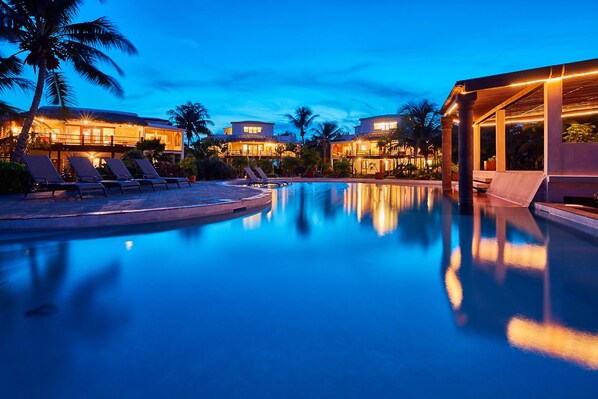 Når solen går ned, kan du krølle sammen med en god bok på hengekøyen, slappe av og se en film på flatskjerm-TVen, eller utfordre gjestene dine til et basseng. Spaser til en av flere topprestauranter minutter unna. Eller middag kan tilberedes av kokken på det fullt utstyrte kjøkkenet og nytes ved levende lys i den separate spisestuen eller tilfeldig rundt den store kjøkkenøyen.