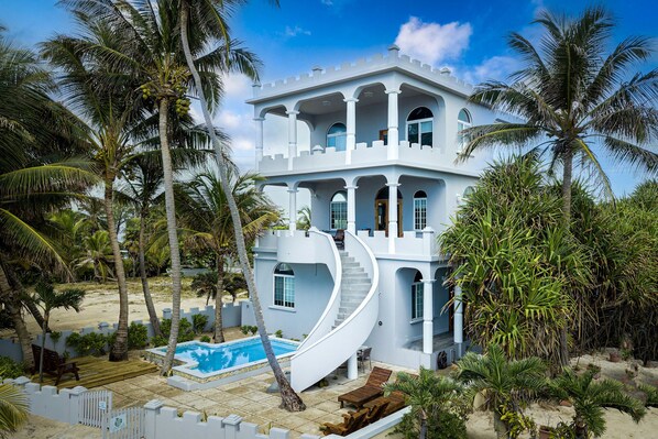 The Sandcastle House, Tres Cocos is a gorgeous 3-story home which was recently thoroughly remodeled. It is located in the exclusive Tres Cocos neighborhood on Ambergris Caye, approximately 10 mins from the town center. The home has a brand-new swimming pool and a beautifully-built private pier with seating area and palapa for great relaxation right on the ocean.