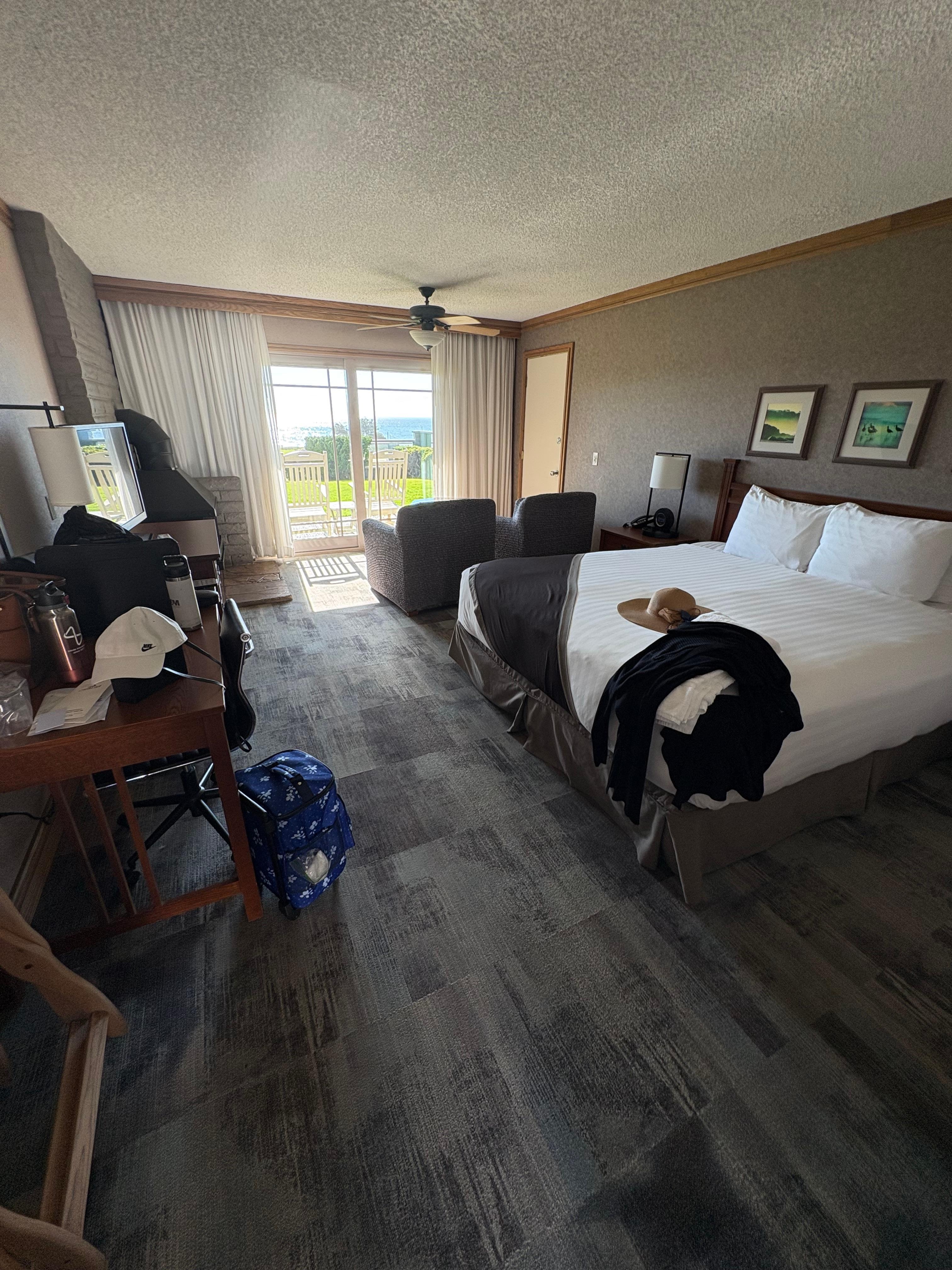 Location was good but a King deluxe ocean view was partially blocked with a tall bush. You could see scum on the pools tile edging. The hot tub felt a little slimy. The back of our door was dirty and marked up with holes. The coffee cup was in a plastic bag but was not washed! The deluxe room was small. No screen in the patio door. No microwave. They put so much stuff in the honor bar there was hardly any room for our stuff. For price it was doable $178/nt. It was a great place for dogs. Saw lots of pups! Probably won’t be back though