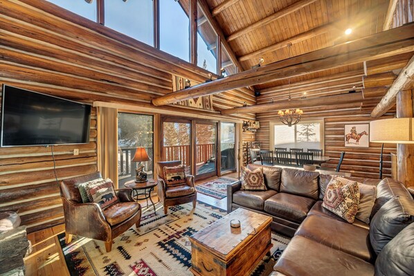 The Black Bear Chalet boasts 3,600 sq feet of exceptional living space. The great room is beautifully appointed with soaring double volume ceilings, loads of natural light, and beautifully appointed western style interiors. The custom kitchen is fully equipped with high end stainless appliances and gorgeous granite counters making it easy to cook for a crowd. There is seating for 4 at the bar counter, and a dining table for 8. The great room opens to an expansive wrap around deck with your own private hot tub to soak, stargaze and enjoy stellar Rocky Mountain views.