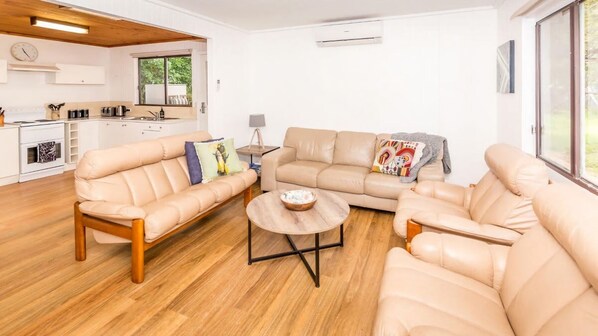 This cosy home sleeps (7) people, the master and second bedroom have Queen beds, the third bedroom has a double bed and single bunk above. The kitchen & lounge area is open plan and opens onto the large deck with BBQ and outdoor table & lounge.