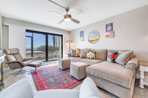 Direct gulf-front views from the lanai and master. Ground-floor location is baby steps away from two sandy paths that put you right on the beach. Go right? Go left? All paths lead to our world-famous beach!