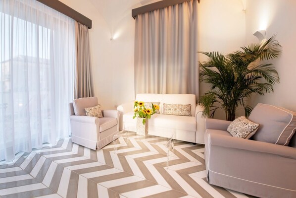 Our Spacious and Modern Sorrento Luxury Suite is fully furnished with key design features and elements and can accommodate up to 3 guests. The suite features state of the art luxury amenities, typical of a 5-star property, with the highest quality materials and furniture such as Frette linens, Simmons mattresses, Marble Floors, FreeStanding Bathtub and Gold Accents.