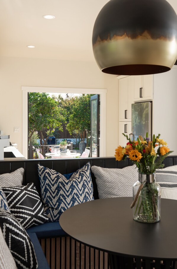 An intimate and romantic table with a comfy and cozy built-in bench seat.  Beautiful views of our stunning outdoor areas on display. Forgo indoor dining and take your delicious meal outside to our outdoor dining setup. The open floor plan provides easy access between our kitchen and dining area.