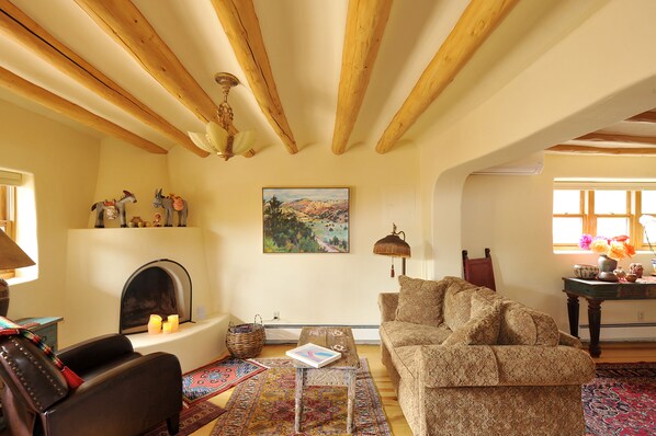 Dette er en original tykk adobe walled Casita. Det er en oldie men godie med all Santa Fe sjarm du leter etter. Dette er ikke et moderne hjem eller hotell, men har alle moderne bekvemmeligheter du trenger. Den casita har vigas med tradisjonelle takkledde tak unike for Santa Fe området, tykke adobe vegger og buede døråpninger. Saltillo fliser dekker bad og kjøkken gulv. Massive furu gulv dekker soverommet, spisestue og front rom med antikke tepper som vi har samlet rundt om i verden.
