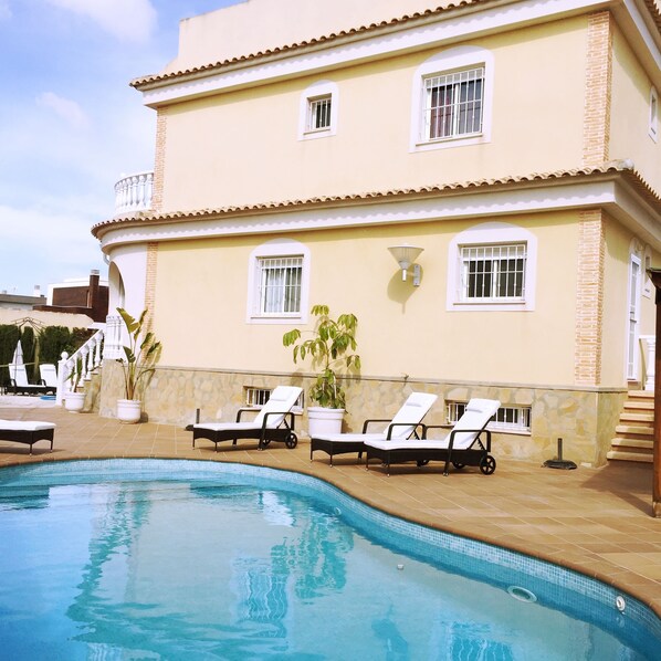 Golf og strand feriehus er en vakker stor privat villa i Gran Alacant, det er en større enn gjennomsnittlig hjørne tomt 147. 00m2 boareal, inkludert solterrasse, terrasse og balkonger 500m2, med privat svømmebasseng, rikelig uteplass område rundt bassenget . Det er tre doble soverom, med (totalt senger 5 senger, to 135 cm dobbeltsenger og 3 105 cm enkeltsenger), alle med garderober, og ett med eget bad. Alle soverommene har aircondition. Stue / spisestue med satellitt-TV Fullt utstyrt kjøkken med alle hvitevarer. Stor uteplass gir rikelig med områder for soling, fritid og uteservering. Det er en utendørs terrasse utenfor master bedroom, ideelt for din morgenkaffe og papir. På den store terrassen, under pergola, er det en spiseplass. Det er en fronthage, men ikke fullstendig moden, er flott for å chill. Hvis du trenger barneservice, inkludert barnevakt, barnesenger, barnestoler etc. vennligst kontakt meg via e-post. (Vær oppmerksom på: Vi kilder et rengjøringsfirma lokalt, derfor grunnen til en rengjøring av 90,00 € i feriestedet. Hvis du bare er 2 personer som bor en natt, vil jeg gjerne redusere dette til 65 euro - (inkluderer sengetøy og håndklær)