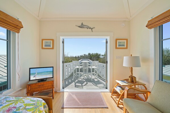 Guests can head up a set of stairs to the split-level second floor to find a large king primary bedroom, featuring a full, large, private bath with double vanities. Additionally, there is a half bath at the landing of this level of the home. Finally, make your way to the third level to discover a magical aspect of this incredible retreat- a glass-enclosed tower room, which opens onto an open-air deck, offering an amazing view of the town. In this room, you will find a twin bed for an additional guest. If you need a beach reset, look no further than ‘Banana Republic!’