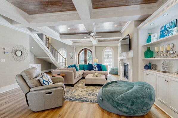 The gorgeous interior is tastefully furnished with contemporary elegance, featuring a cheery, coastal motif throughout. Designed with group gathering in mind, the main floor living area boasts a spacious, open layout equipped for guest comfort and convenience. Sprawl out on the wraparound sofa in the living room while chatting with friends and family or stream your shows on the smart TV, equipped with Apple TV. Store your favorite bottle of wine in the wet bar's beverage fridge and enjoy a chilled glass later during happy hour. Those culinary-minded in the group will find the kitchen well-appointed for home-cooking, featuring a deluxe array of stainless steel appliances including a five-burner gas range and vent with pot-filler faucet, deep-basin sink, and dishwasher. An island prep station doubles as a breakfast bar with seating for four. Sit down for family-style meals at the dining table set for eight. A full bathroom is located on the ground floor for household convenience.