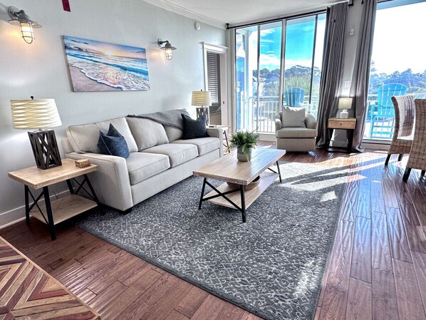 Our 2-bedroom, 2-bathroom condo offers all the comforts of home with added luxurious touches, making it the ideal spot for a relaxing and rejuvenating escape. The spacious and beautifully decorated living room is the perfect spot to unwind after a day spent at the beach or exploring the town. Take in the breathtaking views of the ocean from the balcony, or simply cozy up on the comfortable couch and catch up on your favorite shows on the flat screen TV.