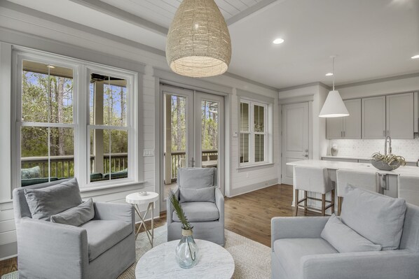 This home was perfect for my family of 9 (2 couples, 5 teens/college kids). We enjoyed making meals in the kitchen while the kids hung around in the sitting area watching football games or playing cards. The Living room was perfect for watching movies and larger family games. The proximity to Publix and Seaside was great. We also enjoyed the views into the forest around us.