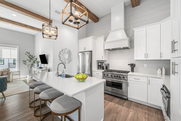 Kitchen: This large kitchen is fully stocked for making meals with large families. It has crisp white cabinets and countertops and a warm tone. Includes a microwave, dishwasher, stove, 1 refrigerator, toaster, Keurig, coffeepot, crockpot, griddle, and blender, as well as all the standard utensils and cookware. There is also a counter-height bar with 4 bar stools.
