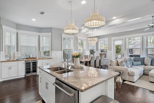 Step inside Rosé Sunsets and feel the inviting vibe of the beautifully decorated first-floor living space. Hardwood floors and comfy furnishings create an atmosphere that says, "Relax, you're on vacation!" The living room is your entertainment haven, featuring a 70" flat screen TV with a Sonos Home Theatre – perfect for movie nights or catching up on your favorite shows.