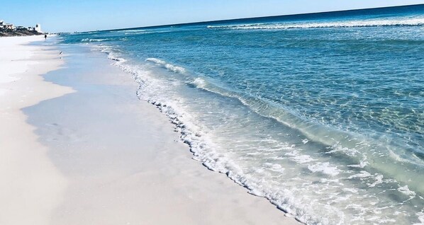 Eiendommen sitter direkte på 30A i et område som kurver i svært nær stranden. Gated tilgang til vår private strand ligger rett over gaten og stranden er mindre enn 100 meter unna. En vakker, avslappende strand som ikke blir så overfylt som andre strender i området. Mens vi tilbyr strandstoler og en paraply, er det også en strandstol utleie på stranden som du kan reservere ukentlig eller daglig. Det er flere fine små restauranter, frisørsalong, klær, smykker og møbler butikker rett ved siden av leiligheten vår.