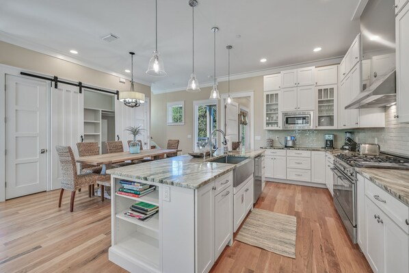 Second Floor: Er hovednivået i hjemmet. Der finner du et idyllisk luksuriøst kjøkken med et innebygd Marvel kommersielt 48 ”rustfritt stål kjøleskap og et stort 48” Bertazzoni gassutvalg med doble ovner. Oppvaskmaskin, stor våningshus, søppelhåndtering, mikrobølgeovn og alt du trenger i et gourmetkjøkken. Plassen er ideell for samling, og inkluderer et spisebord for 8-10 og sitteplasser på øya for 3. Ved siden av kjøkkenet er samlingsrommet for familie og venner der velutstyrte omgivelser lar deg se 55-tommers flatskjerm-TV, lese eller gå ut på et av de to andre nivå-dekkene for å nyte den friske Seagrove Beach-luften. Gulvet har også et luksuriøst hovedsoverom med en king-seng med 40-tommers smart-TV og et fenomenalt luksuriøst mesterbad. Hovedsbadet kan skilte med en dobbel dusj og frittstående støpejernsklo-fotbadekar sammen i et kombinert rom. Det inkluderer et veldig stort mesterskap koblet til det rikelig vaskerommet. Vaskerommet tilbyr også et skrivebord for kontorarbeid i tilfelle ferietiden din krever innsjekking på kontoret fra tid til annen. Gulvet kompletteres med et halvt bad for å betjene kjøkkenet og det underholdende området. Den ene verandaen har uteservering med plass til 8 personer. Den andre verandaen har spiseplass, stol og sidebord. Gulv i alle områder unntatt badet er 4 "eik, hard og lys.
