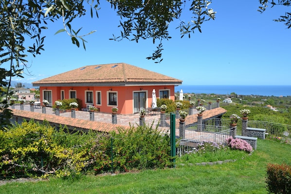 Villa Etnamare is situated up on a hill overlooking the green East coast of Sicily, between Mount Etna and the Ionian sea. It is surrounded by a land of five hectares dotted with heavily laden citrus trees and flowers.