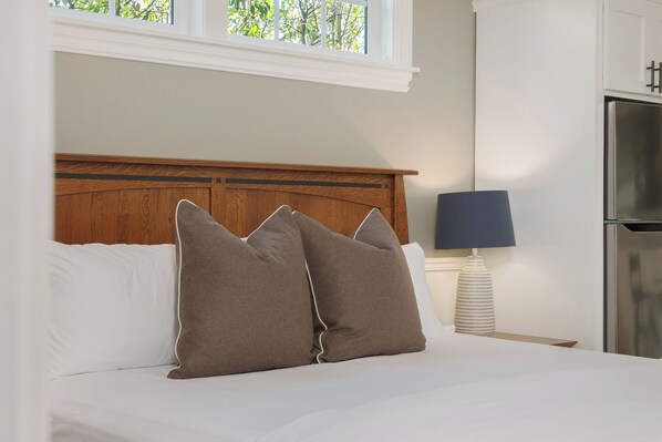 Every bungalow includes a spa-inspired bathroom with a walk-in shower, a well-appointed kitchenette, and dedicated sitting and work areas—ideal for both short visits and extended stays. Guests enjoy luxury bedding and premium linens, ample storage, and a curated selection of furnishings designed for comfort and functionality.