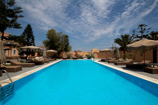 På stranden og med utendørsbasseng, nær Gamle Thira