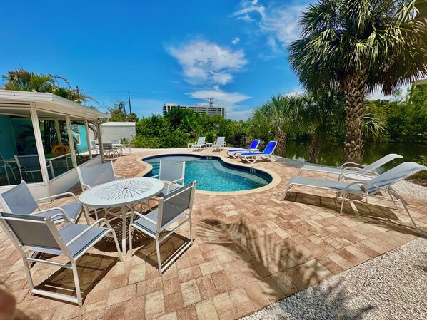 Bassengutsikt 1 king bed Gå til stranden privat skjerm veranda 16. AUGUST