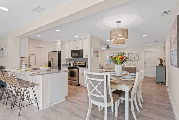 - Living Areas: Enjoy the front living room with a new sectional sofa and 70` Roku TV with Guest Mode. The adjacent dining area seats six and is near a fully equipped kitchen with all necessary appliances and a breakfast bar with four seats.