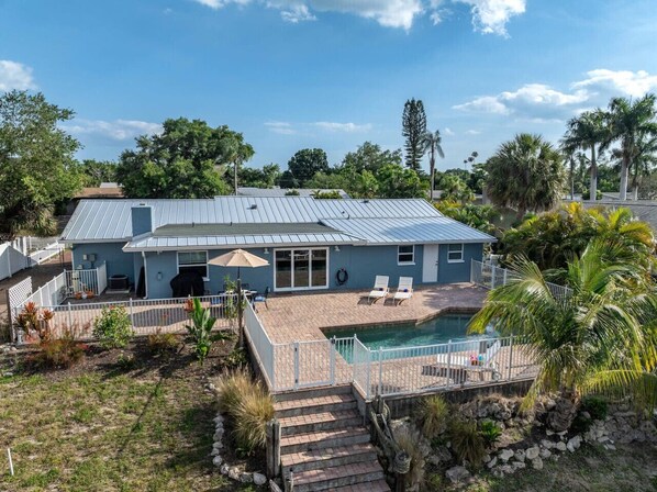 Be among the first to enjoy this charming 3-bedroom, 2-bath home with breathtaking views of Phillippi Creek. Dive into relaxation with a refreshing pool and luxurious new furnishings. The space includes a fully equipped kitchen, two large Roku smart TVs in the living areas, and a 50` Roku TV in the master suite. Essential bathroom amenities are provided for your comfort.