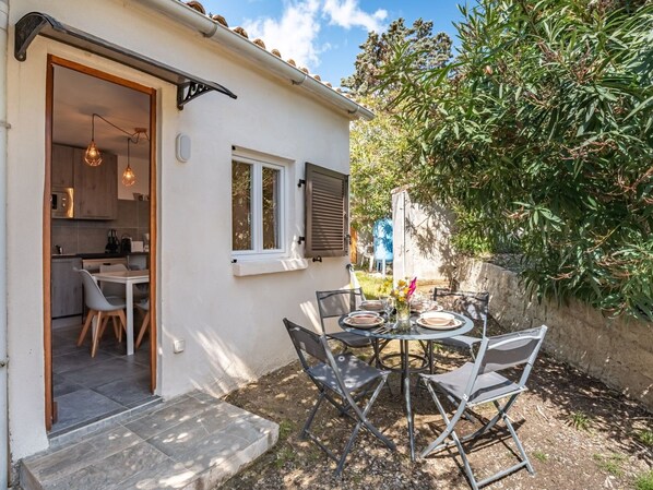 The property offers practical and beautiful furnishings. The open kitchen is equipped with 2 hot plates, a dishwasher, toaster, microwave, electric coffee machine, and Nespresso capsules (extra cost). Other amenities include a shower/WC, electric heating, and terrace furniture. Air conditioning is available in the living/dining room.