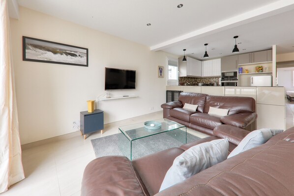Accommodating up to 4 people, the apartment offers you a living room/living room with refined decor, opening onto the balcony, with a fully equipped open kitchen, ideal for preparing delicious meals: induction hob, refrigerator, oven, oven, oven, oven, microwave, microwave, oven, microwave, microwave, dishwasher, dishwasher, coffee maker, toaster and kettle. At nightfall, you can rest in one of the two rooms offered by the apartment. The first has a queen size bed, ideal for parents, while the second will delight children with its two single beds. For optimal comfort, two shower rooms are at your disposal, as well as a washing machine! This apartment has a private outdoor parking space and a garage in which you will have at your disposal a charging socket for electric vehicles (220 volt outlet, 3KWH).