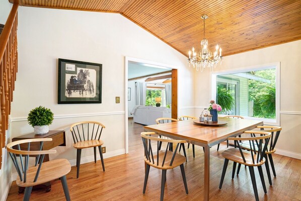 The kitchen and adjacent dining space provide everything you would need except the food. From a full breakfast to Thanksgiving turkey, you will feel right at home. During the warmer months, head out to the back porch and enjoy your meal alfresco before heading out to the fire pit for s'mores.