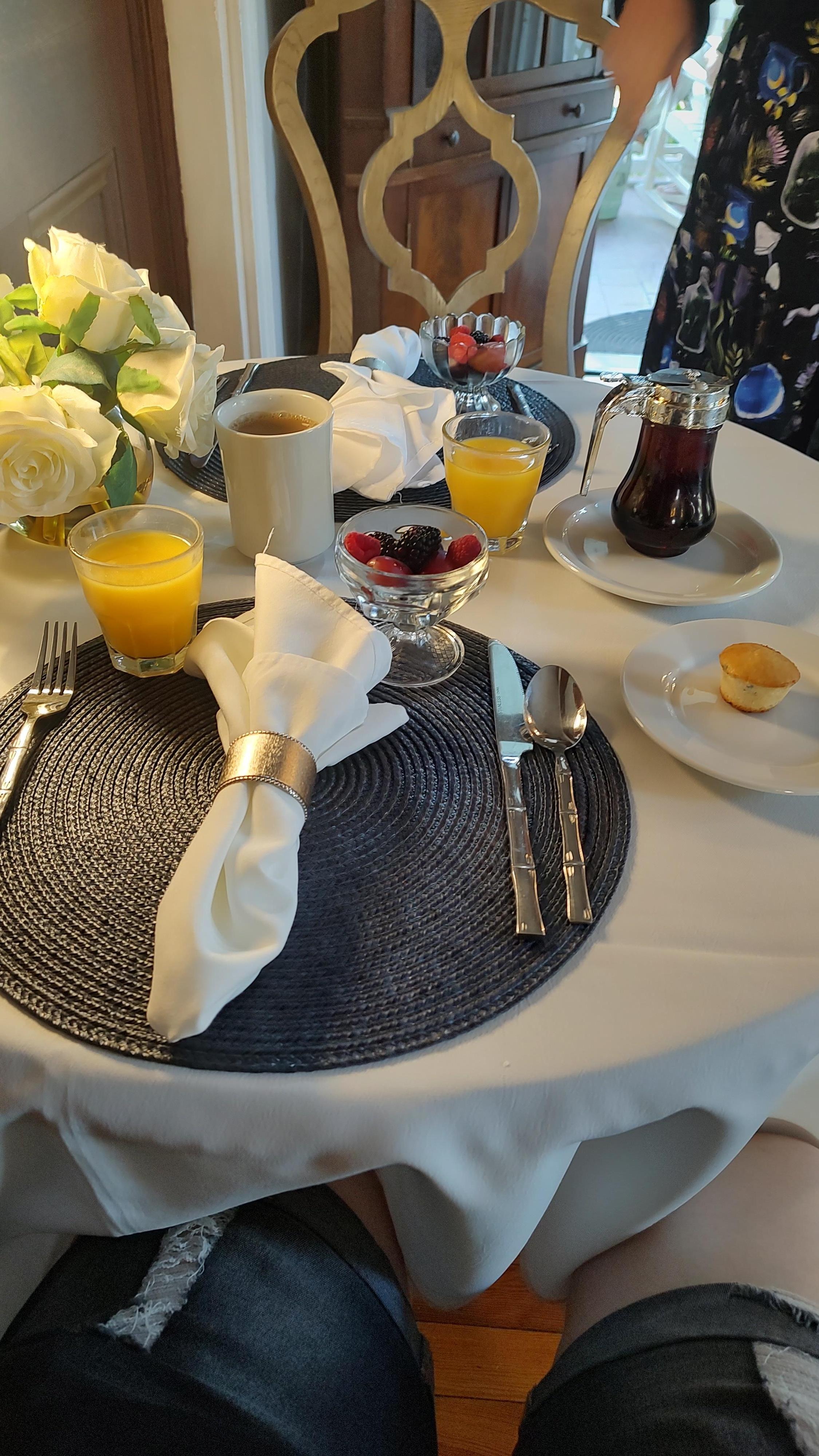 The breakfast was delicious, and the staff were all very friendly! We were given peach cobbler when we checked in. The whole property was charming and welcoming. Our room was a good temp, and the bathroom was spacious. All in all, an amazing experience. Would recommend this inn. And it's across the street from Forsyth Park, which is lovely.