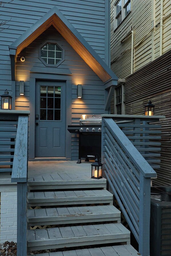 Private outdoor area featuring a seating space and charcoal grill, ideal for relaxing or enjoying casual outdoor meals.