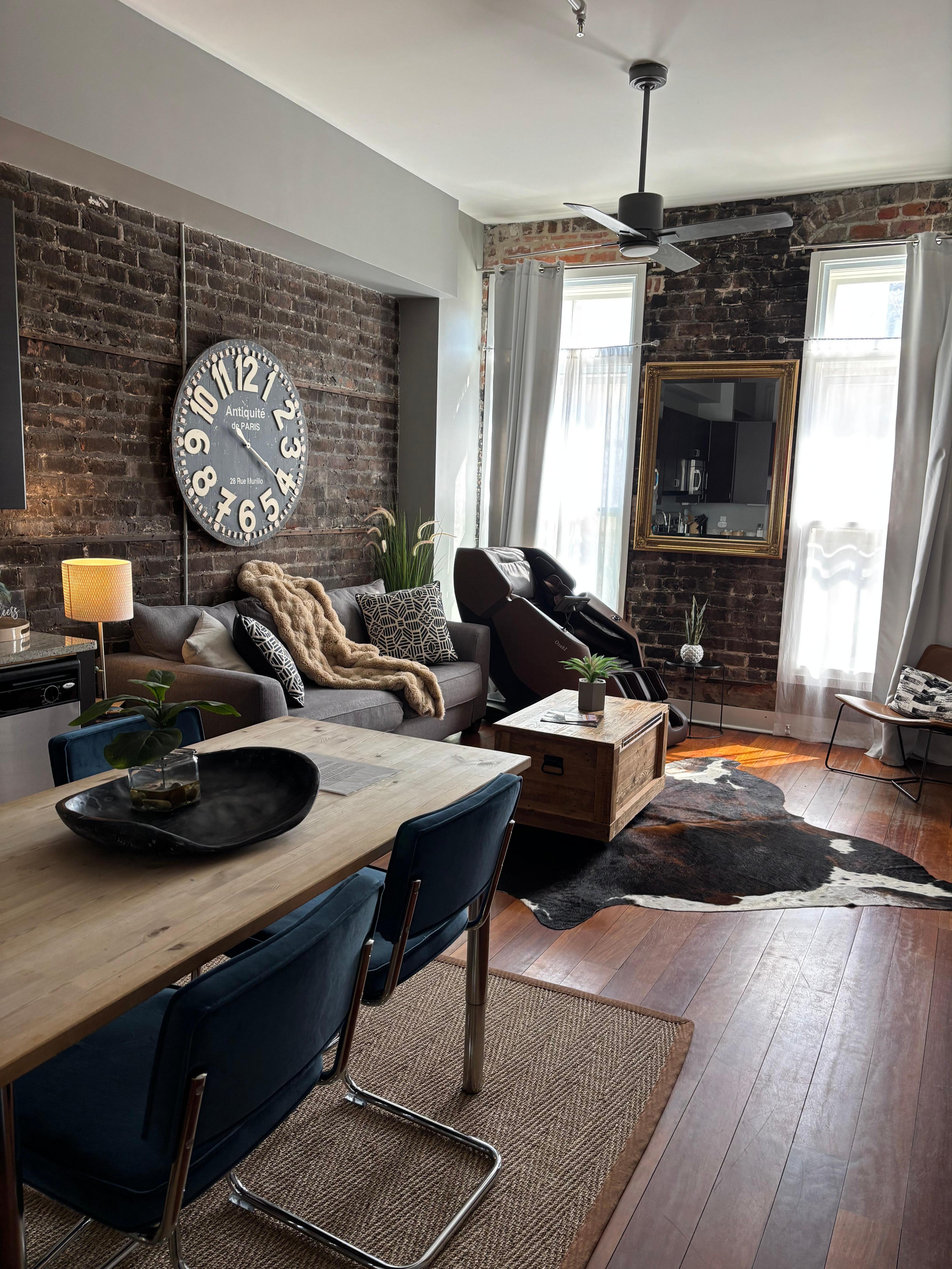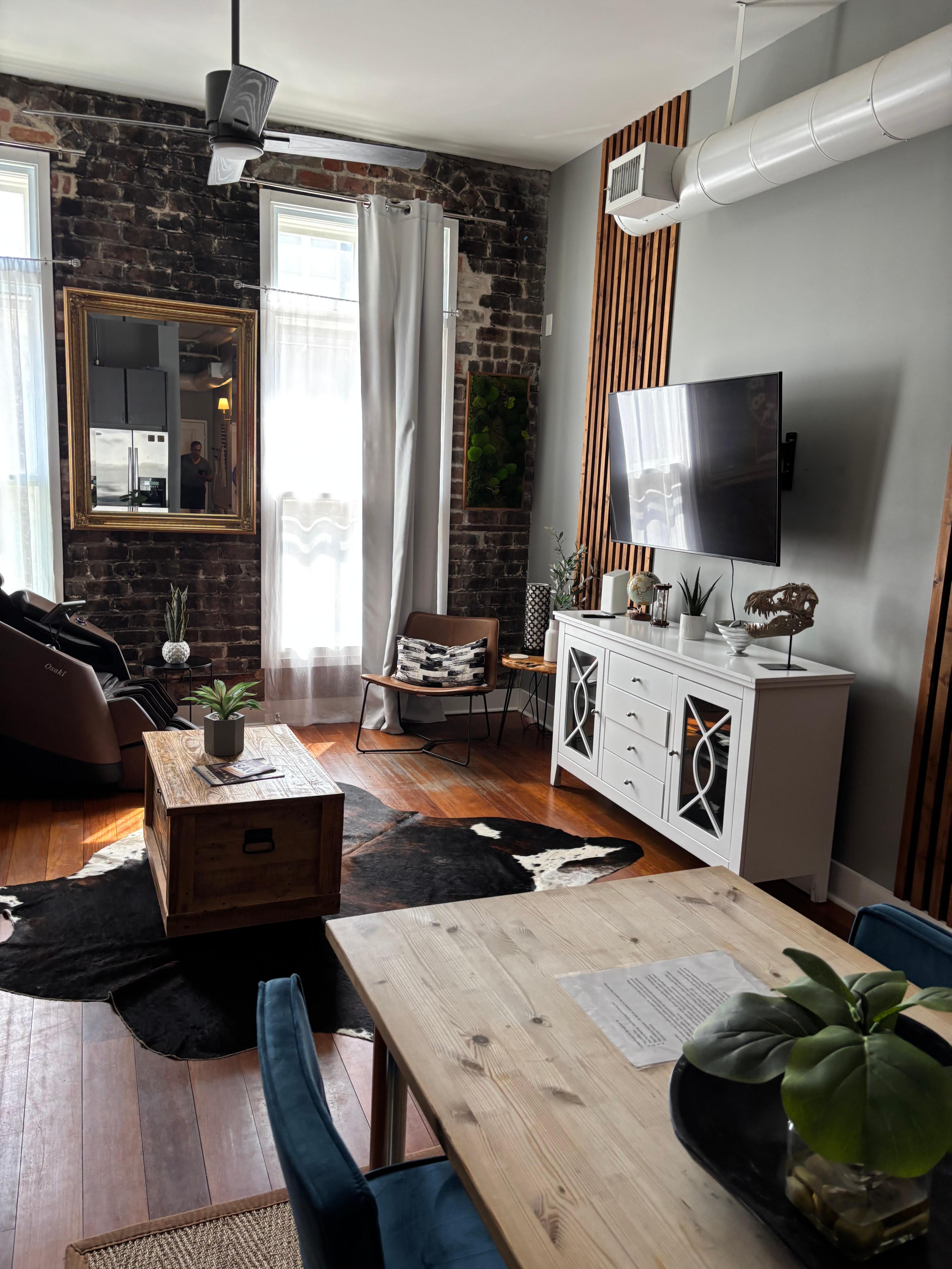 Step into this beautifully renovated loft, where modern sophistication meets historic charm. The sleek, moody ambiance invites you to relax in style. An open-concept layout seamlessly blends the kitchen, dining, and living areas, all anchored by striking dark-washed brick walls. The kitchen boasts floor-to-ceiling cabinets, a full suite of premium appliances, and everything you need to prepare gourmet meals, brew a perfect cup of coffee, or mix a craft cocktail.