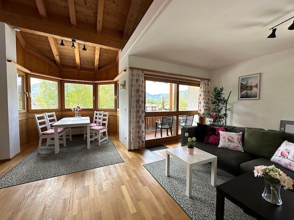 wir hatten ein sehr schönen Aufenthalt in der Wohnung. Es begann schon mit einem freundlichen herzlichen Empfang.Die Wohnung ist sauber und gut eingerichtet. Sie ist groß und offen, was wir sehr genossen haben. Wir haben auch nichts vermisst.Man kann gemütlich auf den Balkon sitzen, davon hat man einen zweiten für die Wäsche zum trocknen. Mahlzeiten kann man am Erker einnehmen und kann auf die umliegenden Berge schauen.Fussläufig ist auch alles zu erreichen, der See, Einkaufsmöglichkeiten, Cafes. Man kann direkt zu Wanderungen aufbrechen - auf den Schlierberg, die Gindelaml oder zur Burgruine. Wir haben den Aufenthalt sehr genossen.Unsere Tochter hat in der Galerie mit eigenem WC genächtigt, gewohnt und fand das auch sehr gut.