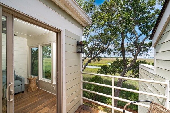 The third level opens up into the great room with soaring ceilings and awe inspiring views of the marsh beyond. Comfortable furnishings invite you to settle in with HDTV for catching up on your favorite shows. Adjacent to the great room is a cheery sunroom. This room has a pull out sleeper sofa with sliding door access to a small upper deck. In addition, there is another full bath on this level.