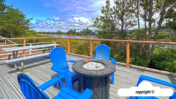 RIVERVIEW COTTAGE in Seaside: This brand-new single-family home has a view of the beautiful Necanicum River and is only two blocks from Seaside Beach. Whether your vacation plans include playing in the surf, crabbing, walking the Promenade, or exploring downtown Seaside, you can feel at home here. Enjoy the well-appointed open floor plan, to gather with your friends and family. The kitchen has brand-new appliances for all your cooking needs and an island for extra prep space. Have fun playing cards, games, and family meals at the live edge dining table and bench, with additional seating at the island bar. The living room has space to relax with family and friends, with a large sofa and two spacious armchairs. There is also a huge deck with a fire pit and picnic table to gather around on those warm summer days! There is a half bathroom conveniently located on the first floor. Upstairs you have a spacious full bathroom in the hall for your guest rooms. In the first guest bedroom, snuggle up in a queen bed, with a view of the river. The second guest bedroom is perfect for teens and kids with a twin daybed, bunk beds, and a trundle bed. Across the hall is the master suite, you can relax in a king bed, private en-suite bathroom, and walk-in closet. There is a full-size washer and dryer in the laundry closet on the second floor. Parking includes a single-car garage along with a private driveway.