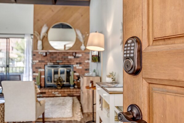 Living Room: This space holds comfortable furnishings including a queen sleeper sofa, accent chairs, 46” Smart TV, decorative fireplace (non-functional) and access to a private balcony. The space is accentuated by a high wood beam ceiling. Enjoy a night in with some board games or a puzzle!