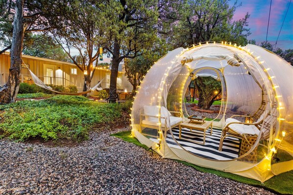 Experience Indoor/Outdoor Living in the Red Rocks featuring our unique Glamping Bubble in the expansive Backyard. Designed & decorated by "Interiors by SHA".