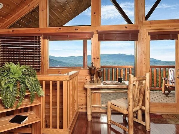 Sov "Under the Stars" på toppen av fjellet. Spektakulær utsikt venter med utsikt over Pigeon Forge. Denne vakre 4-roms med king-size-senger, fire bad, luksuriøse tømmerhytte ligger i Starr Crest Resort og tilbyr førsteklasses overnattingssteder. Hovedsoverommet ligger i hovedetasjen. To soverom ligger i underetasjen. Den endelige sengen vil være plassert i loftet i toppetasjen og inneholder et tilstøtende bad med innendørs boblebad og dusjkabinett. Møblert med vakre Aspen Log Møbler og et fullt utstyrt kjøkken med alt du trenger å lage mat bortsett fra maten! Denne hytta tilbyr også underholdning, inkludert et biljardbord, airhockey og et klassisk videospillsystem som alle ligger på loftet. Nyt en avslappende kveld mens du bader i det private boblebadet ditt på øverste nivå, og kan du nyte utsikten eller sitte koselig foran den elektriske peisen i stuen.