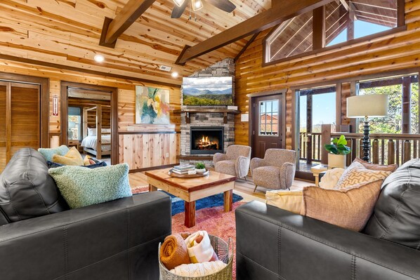 - Living room with indoor fireplace, large TV, and views of the mountains beyond