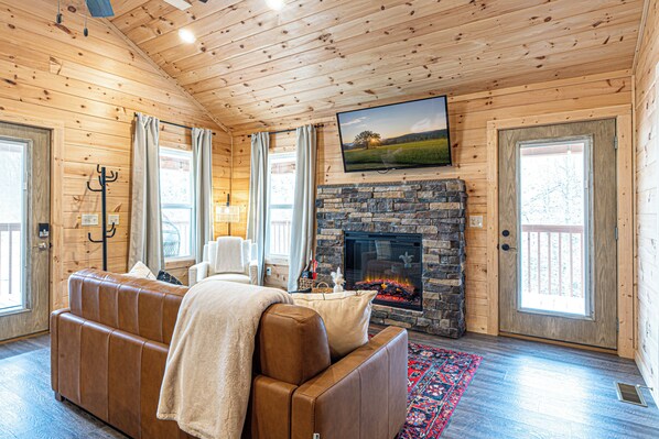 “Getaway on the Bluff Ridge” is a beautiful brand-new 600 sq. ft. log cabin less than 5 miles from the Parkway (close enough for food delivery services). The cabin was built in Summer 2023. Tastefully designed with a modern boho vibe. It is the perfect combination of cozy, clean, and peaceful. Enjoy the large wrap around porch, fire pit, hot tub, wi-fi, or explore the Smoky Mountains!