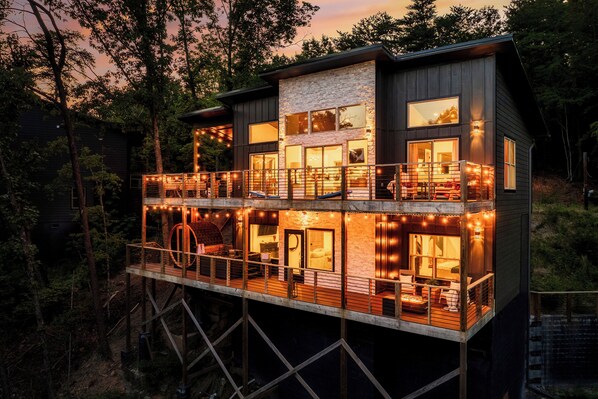 *Upper Deck (partially covered): relaxing daybed swing, fire pit, cornhole, 6 person dining table and grill (we provide the propane)