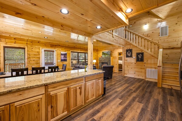 Cook meals in the fully stocked kitchen with both Keurig and drip coffee makers. Share meals at the dining table (seats 8) or gather at the kitchen island (seats 5) for casual breakfasts and snacks.