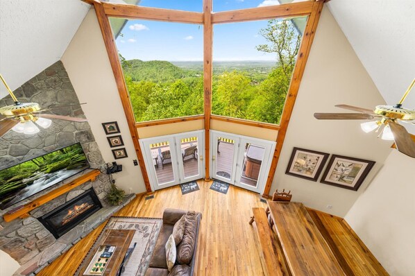 Så snart du går inn i Peekin 'Over Pigeon Forge, blir du umiddelbart møtt av den super koselige stuen som har et katedraltak som suger to historier høyt. Her kan du se dine favorittprogrammer på den store flatskjerm-TVen, koselig opp ved siden av den knitrende peisen eller sparke tilbake og nyt utsikten fra gulv til takvinduene som rammer Smoky Mountains.