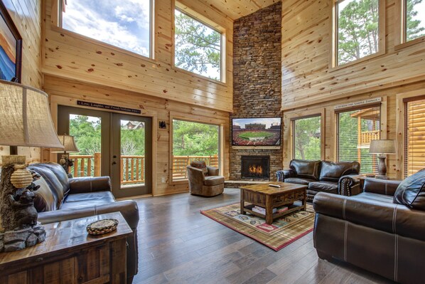 Leter du etter en gruppehytte i smokies? Med et innendørsbasseng, spillrom, boblebad og teaterrom, tilbyr denne hytteferien alt du trenger for en avslappende gruppe getaway. Ta en dukkert i innendørsbassenget på hytta, eller nyt det varme vannet i boblebadet. Om sommeren kan du også sole deg ved bassenget på feriestedet. Tilbake på hytta, ta del i noen vennlige konkurranser i spillrommet som tilbyr biljardbord, arkadespill og 42 ”TV. Nyt en filmkveld i teaterrommet som leveres med surroundlyd. Når du er klar til å slappe av etter en spennende dag, kan du slappe av i et av de fire kongerommene, hvert med en king size-seng, 32 ”TV og fullt bad. Det femte soverommet er utstyrt med to fulle køyesenger. Enten en familieferie eller en vennegjeng som ønsker å besøke Smoky Mountains; dette er den perfekte hytta for deg.