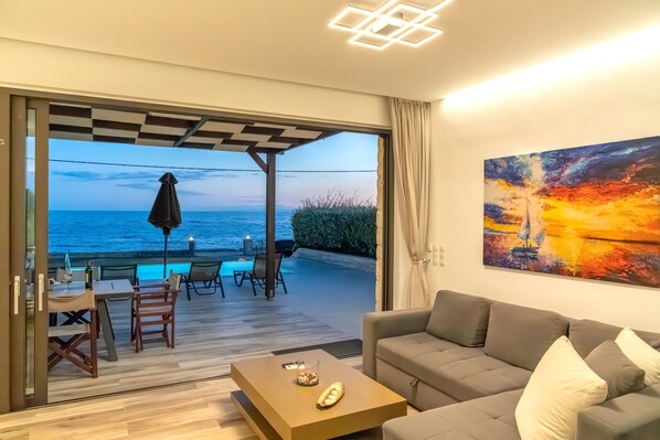 Stuen leder inn til bassenget med en skyvedør. Den private evighetsbasseng er 27 kvadratmeter i størrelse. En overbygd terrasse som ligger ved siden av bassenget er det ideelle stedet å nyte lunsj eller middag med vidstrakt utsikt over havet!
