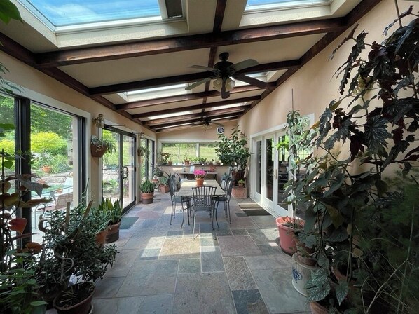 Nyt matlaging i toppmoderne kjøkken, ditt eneste dilemma er hvor du skal spise. Du kan velge solarium, omgitt av eksotiske planter og sola som strekker seg gjennom glasset eller på terrassen, hvor du kan høre brøl av fossen som tumbles nedover fjellet bak huset etter et regn. Eller du kan prøve den formelle spisesalen som fortsatt har den opprinnelige nederlandske ovn fra det 18. århundre. Verandaen er et godt valg for ettermiddagste og utsikt over Highland Cattle i enger. Enda et alternativ er den uformelle frokost- / gårdsbordet på steingulvet nær inngangen til huset. Til slutt er det to stoler på kjøkkenbordet med utsikt over det lysende kjøkkenet, som er delikat aksentert med orkideer. Håndlaget skap i kjøkkenet ble alle laget av et lønnstrær fra eiendommen. Vi har nylig hatt en stor middagsselskap for førti mennesker i frokostsalen etter at vi fjernet sofaen og stolene. Tis var det høyeste jeg vil si. Med alle rom i underetasjen kunne vi ha hors d'oeuvres i spisesalen, en bar i grønthuset, og dans, komplett med en diskotekball i stallen.